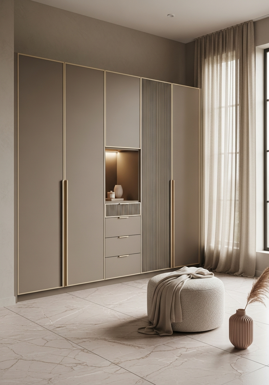 Morning light filters through sheer champagne drapery, diffusing evenly across fluted wardrobe surfaces where vertical rhythm replaces decoration. The 15mm pitch micro-fluting catches light differently at each hour, animating the mushroom-taupe lacquer without demanding attention. Champagne gold PVD reveals at 5mm width catch the eye only when sought — satin finish, pale warmth, architectural restraint. This is steel reimagined for intimate residential calm: durability domesticated through proportion, surface, and tonal warmth.