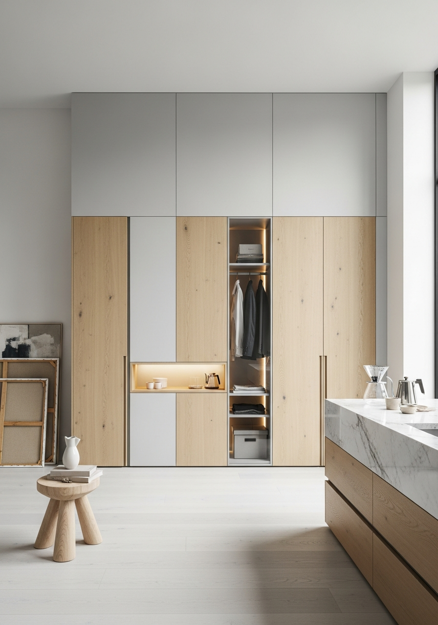The wardrobe reads as a private gallery: even diffused light, material honesty, and surfaces that absorb rather than compete. Quarter-sawn oak provides subtle vertical rhythm; matte lacquer panels act as compositional pauses. The mood is cool-bright and quietly luxurious — no warmth from artificial sources, only the calibrated neutrality of pale timber meeting industrial precision. Proportion, vertical rhythm, and restrained detailing perform more work than decoration.