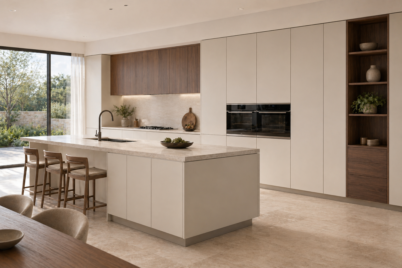 The visual direction should feel bright, modular, and residential. Show pearl-toned cabinetry, pale stone, controlled walnut warmth, a frameless island-and-wall relationship, and daylight that makes the kitchen feel clean, usable, and quietly premium.