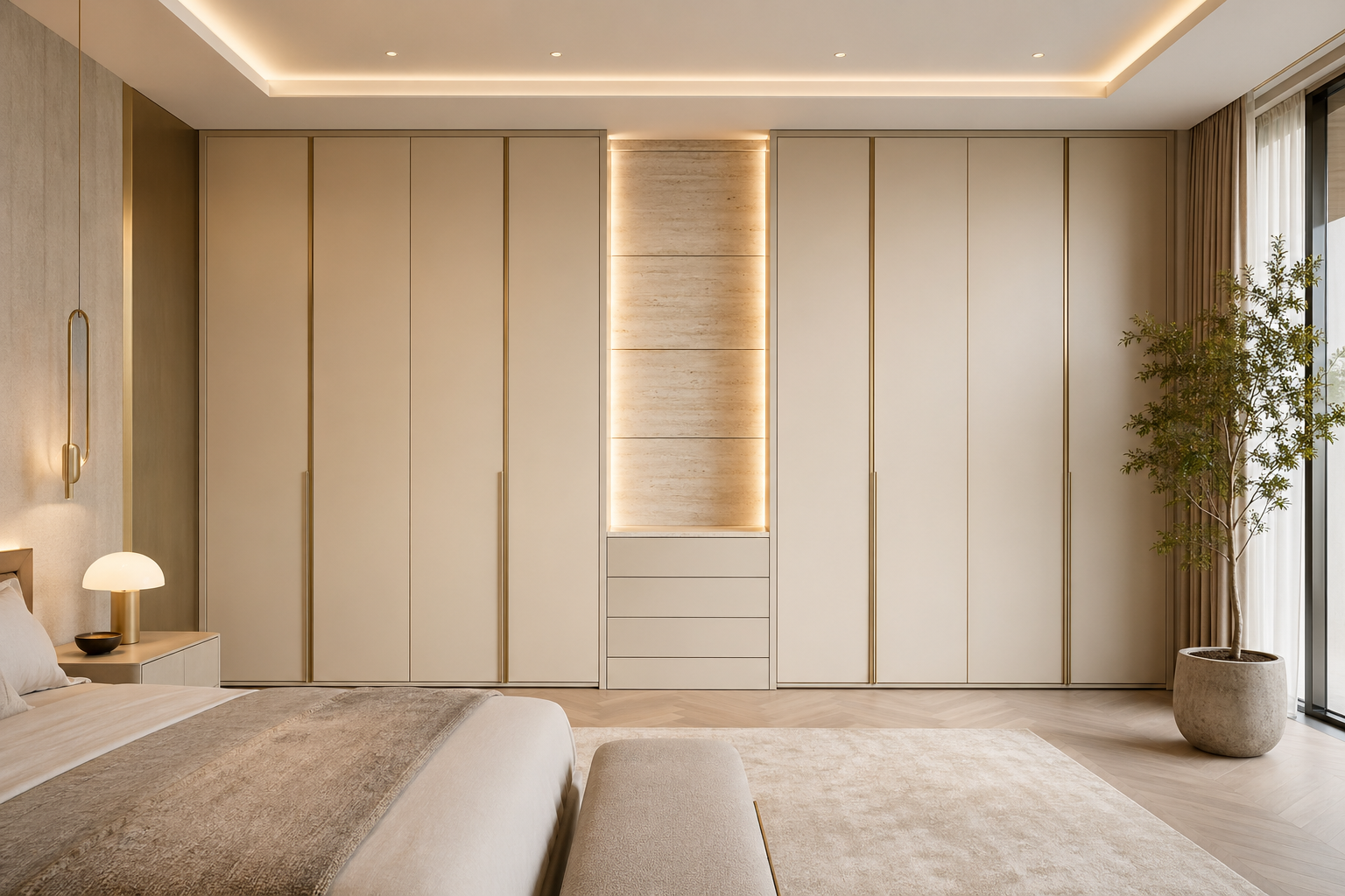 The image direction should feel soft, tailored, and architectural. Show cream wardrobe planes, pale mineral detailing, warm champagne accents, and controlled bedroom lighting that makes the suite feel like a private luxury dressing salon.