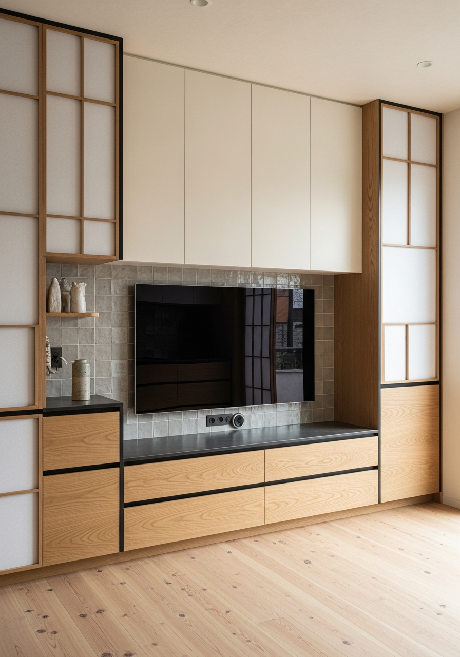 304 stainless steel media wall — seamless construction, zero formaldehyde, quiet Japandi oak