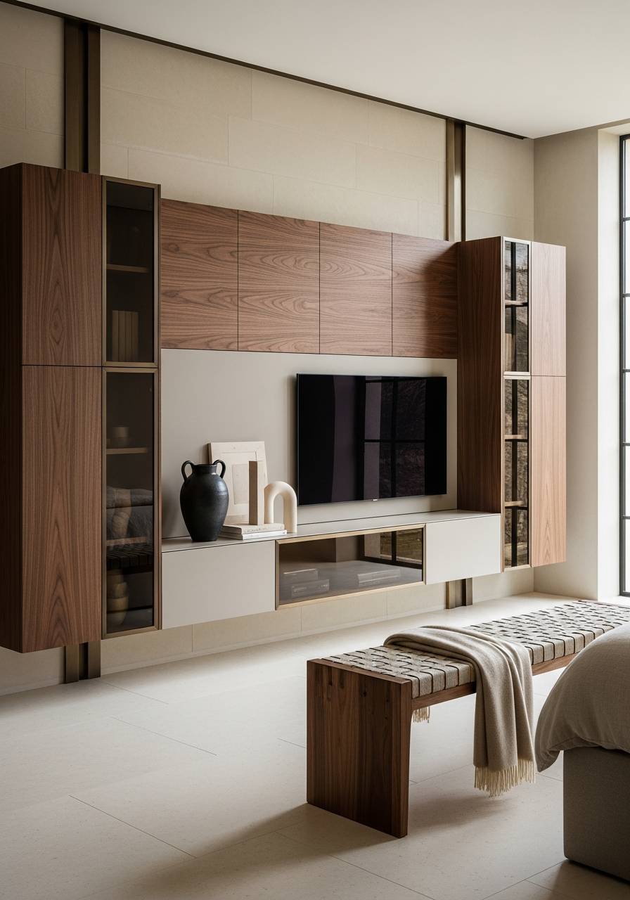 The product should read as warm hotel walnut — a residential hospitality aesthetic that translates boutique hotel calm into domestic space. The visual language centers on horizontal walnut grain running the full width of each module, creating visual continuity and quiet rhythm. Smoked bronze glass introduces depth without reflection, while cashmere lacquer panels provide restful tonal intervals. The overall proportion is low and horizontal, emphasizing wall-spanning presence rather than vertical dominance. Lighting is understood as environmental: soft side wash from gauze-filtered windows, never theatrical or source-visible. The 6mm exposed glass edges catch this diffused light, revealing material thickness and craft precision without demanding attention. Cashmere taupe panels function as deliberate pauses in the walnut rhythm, their soft-touch matte finish inviting proximity while resisting fingerprint visibility.