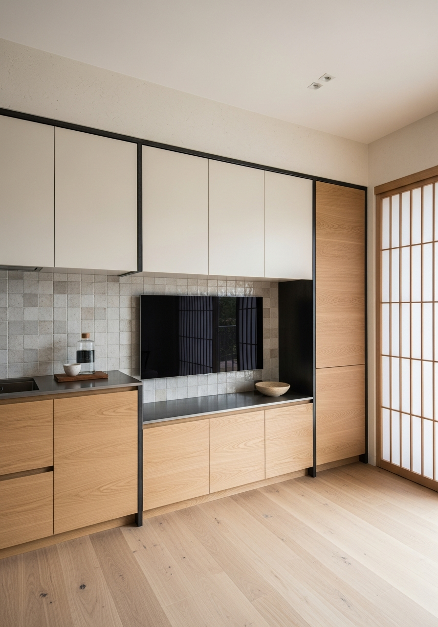 The Quiet Japandi Oak direction governs the finish palette: natural Japanese oak veneer with straight grain and oiled matte surface, balanced against warm parchment white lacquer panels and black iron accent frames at 20mm profiles. Beneath these surfaces, Fadior's 7th-generation glue-free steel frame technology (12 patents) ensures literally zero formaldehyde emissions — not low-VOC, but zero — because no adhesive exists in the structural system. The result meets WHO formaldehyde classification standards for sensitive environments while delivering 100% waterproof performance and a 30-year cabinet body warranty.