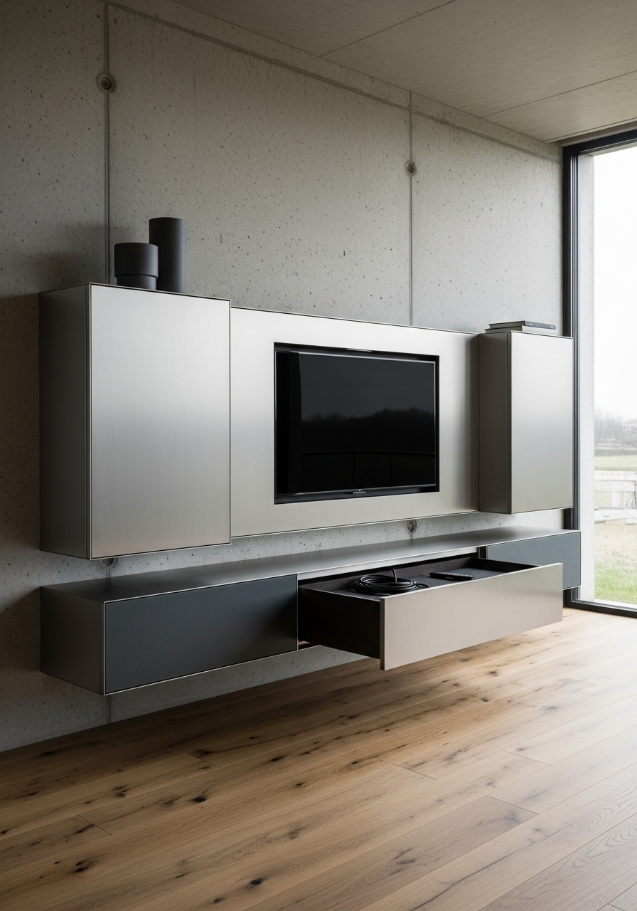 Interior modules can be configured for component dimensions, with rear ventilation channels engineered for thermal management of amplifiers, gaming consoles, and streaming devices. The seamless steel construction allows precise cutouts for cable management without compromising structural integrity. Widths scale to living room proportions while maintaining the vertical-grain panel rhythm and concealed hardware principle.