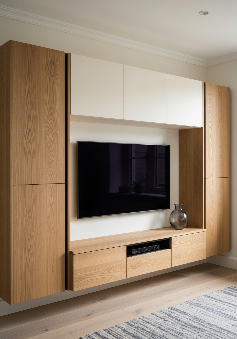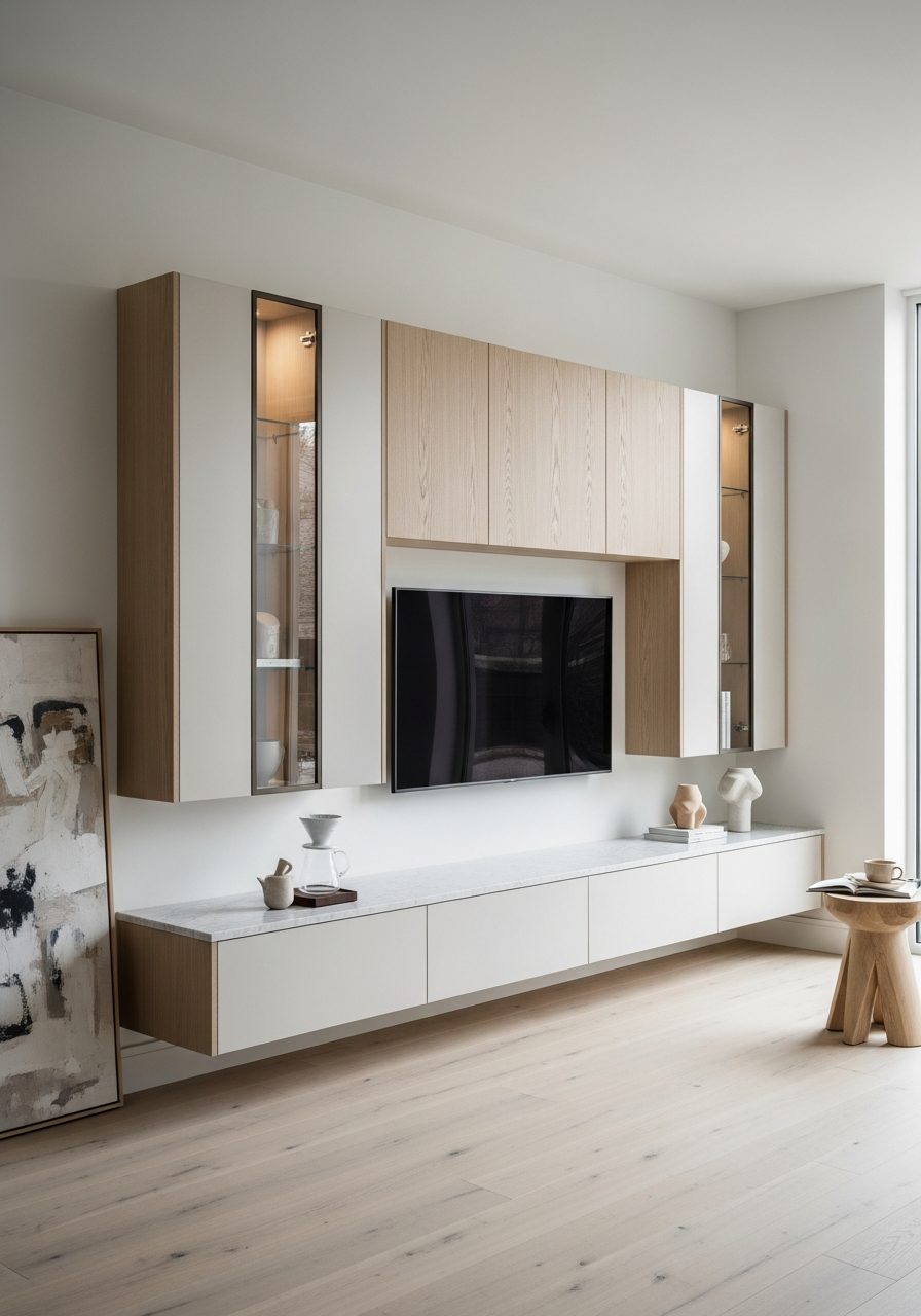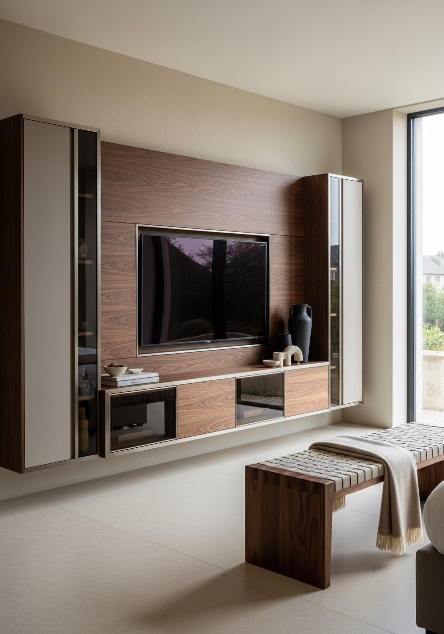 The console reads as crafted timber at conversational distance—dark walnut grain absorbing rather than reflecting light, horizontal striations grounding the wall plane—yet resolves as engineered precision upon approach. Smoked bronze glass filters ambient light into amber warmth, its 6mm edge catching shadow like a lens. Cashmere modules break the walnut field in tonal counterpoint, their matte surfaces inviting touch. The absence of visible hardware—touch-latch mechanisms and concealed Blum hinges—preserves the uninterrupted horizontality of hospitality-suite restraint. This is residential furniture that borrows from hotel logic: sanctuary through material discipline, calm through proportional control.