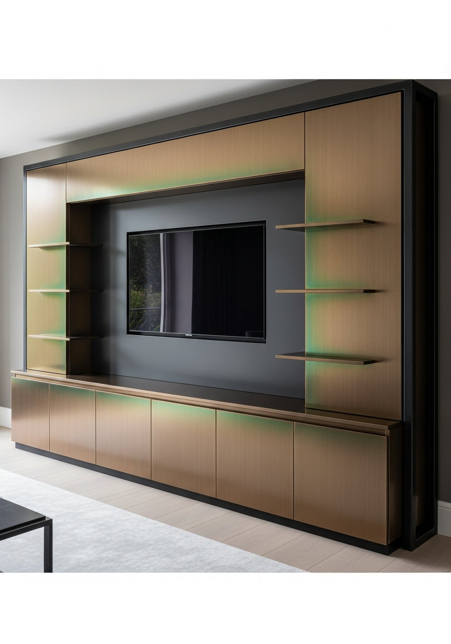The 12mm exposed blackened steel frame with hand-finished edge profile provides architectural presence while the integrated charcoal anodized aluminum media back panel enables zero-visibility cable management. Fadior's 7th-generation glue-free steel frame technology — protected by 12 patents — achieves literally zero formaldehyde emissions, not 'low' or 'reduced'. The acoustic-damped equipment chamber with automated ventilation maintains optimal operating temperatures for AV components while soft-close access panels conceal all technology from view.