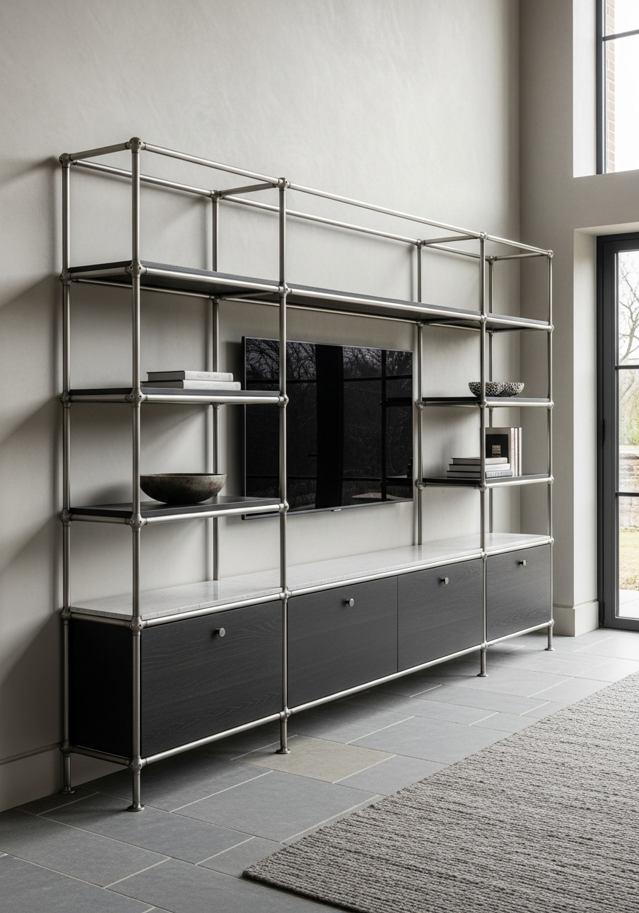 Power and signal cables route through the hollow 25mm square steel uprights, emerging at precise points to maintain clean sightlines. This is not an afterthought; the framework is engineered as conduit. The result is a media console that presents as sculptural object rather than technical infrastructure.
