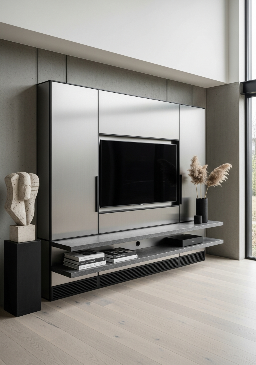 The design manifests as a structural monolith, rejecting traditional joinery visibility in favor of a singular, grounded mass. Brushed stainless steel absorbs ambient light to create a shadowless presence, while 2mm blackened steel reveal strips act as precise architectural punctuation. The palette remains strictly cool—steel silver, charcoal, and concrete grey—maintaining gallery-like calm without domestic tropes.