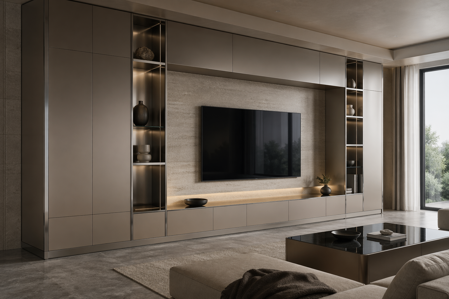 Custom living room cabinetry with real 304 stainless steel structure and calm residential luxury.