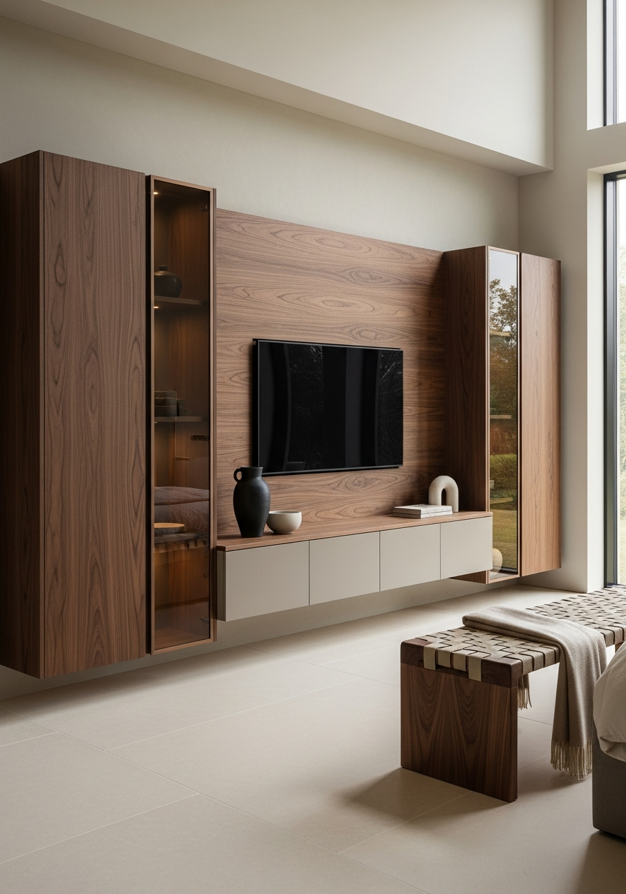 The product should read as warm hotel walnut — a residential hospitality aesthetic that translates boutique hotel calm into domestic space. the palette operates in warm mid-dark registers: walnut with subtle red undertone, cashmere between sand and mushroom, greige with plaster-like pink warmth. surfaces reject gloss entirely in favor of open-pore matte tactility. lighting is architectural and lateral — soft diffusion from floor-to-ceiling glazing filtered through sheer linen, never overhead retail wash. the mood is restrained occupancy: lived-in but uncluttered, sophisticated without display-case staging., with proportion, horizontal emphasis, and material honesty doing more work than decoration.