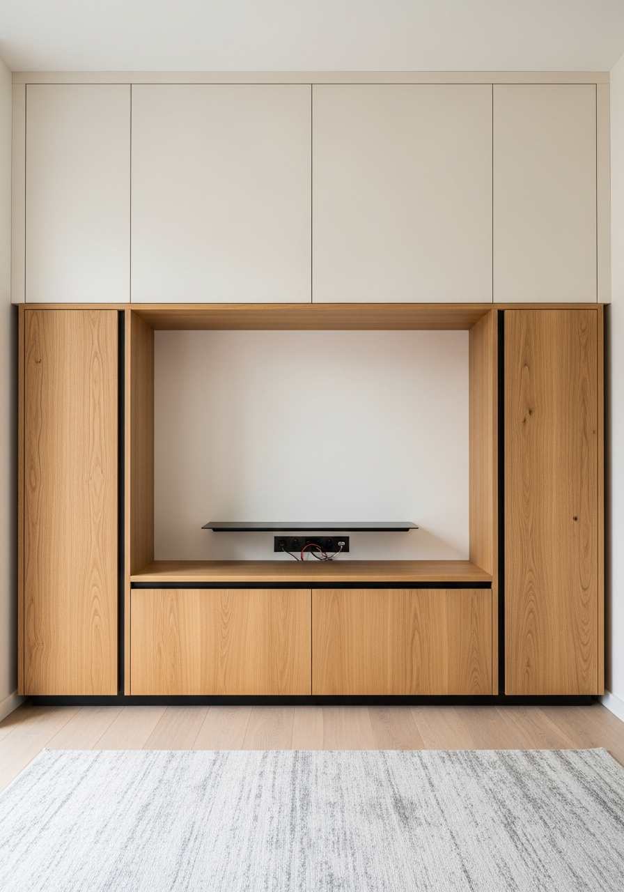 Module widths, internal zoning for AV components, and the balance between open display and concealed storage can be configured to your living room brief. Fadior offers 80+ powder coat colors baked at 220°C, PVD metallic finishes including bronze and champagne gold, and alternative 3D wood-grain transfers. The Essence design language — asymmetrical calm, material honesty, shadow-line precision — remains constant while proportions adapt to screen size, wall dimension, and residential context.