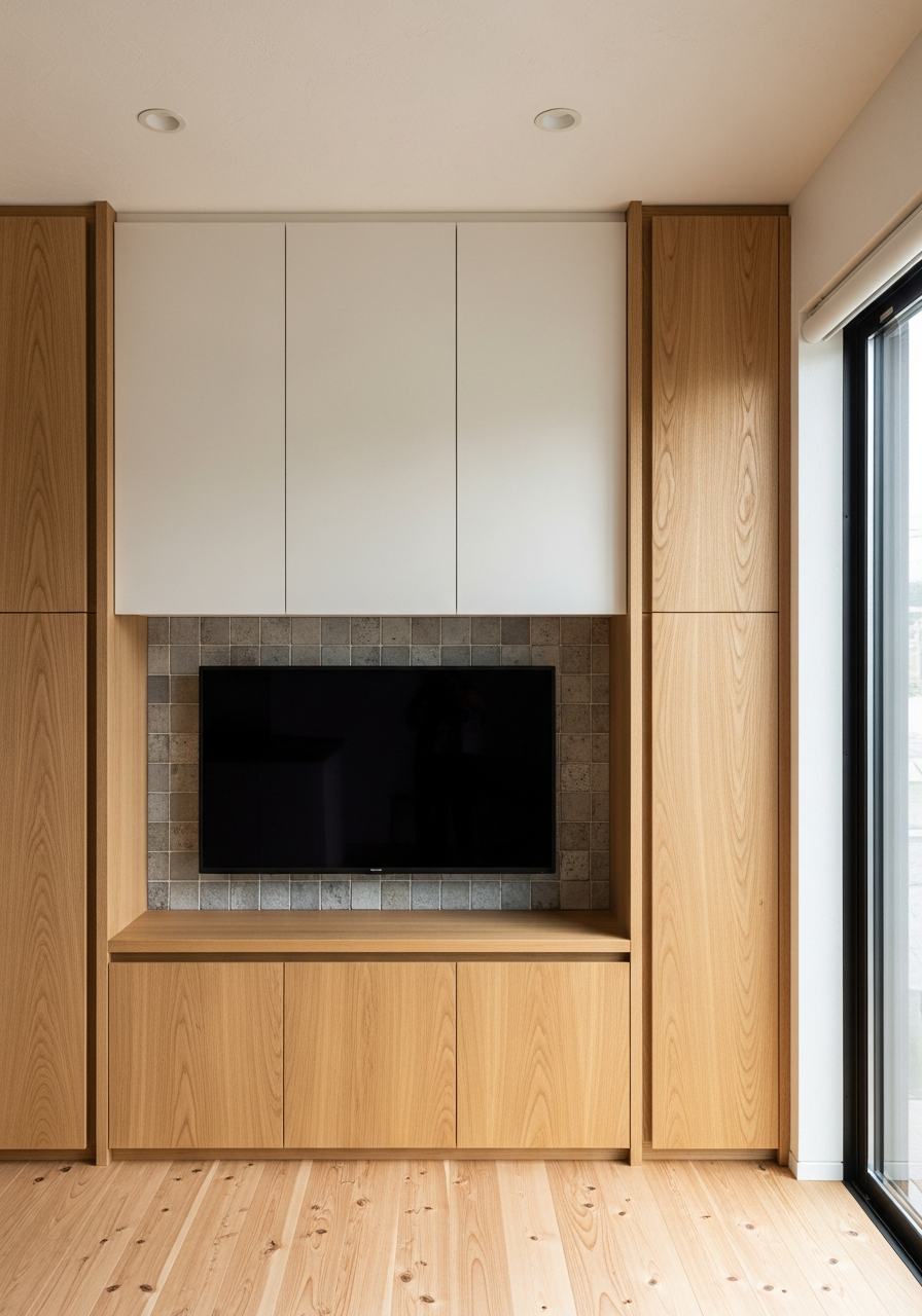 The console's Shoji-inspired upper cabinets feature warm parchment white lacquer on steel substrate — a powder coat finish baked at 220°C to achieve paper-like flatness with eggshell matte texture, diffusing ambient light while concealing AV components. Hand-forged black iron accent frames at 20mm profile create subtle shadow lines between oak and lacquered elements, their slight surface variation introducing handcrafted warmth into the restrained Japandi composition. Integrated cable management routes through hollow steel structural members, maintaining clean sightlines from all angles without external channels or visible hardware.