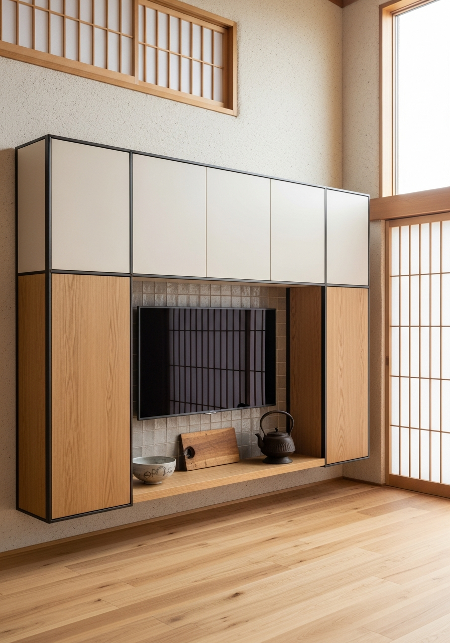 Console width, internal compartment zoning, and the balance between open and concealed storage can be configured to specific AV equipment requirements. Fadior offers 80+ powder coat colors baked at 220°C, PVD metallic finishes in bronze, champagne gold, and rose gold, plus 3D wood-grain transfer options for alternative timber aesthetics. The Japandi proportional logic — low horizontal mass, floating upper elements, restrained material palette — remains constant while dimensions adapt to living room scale.