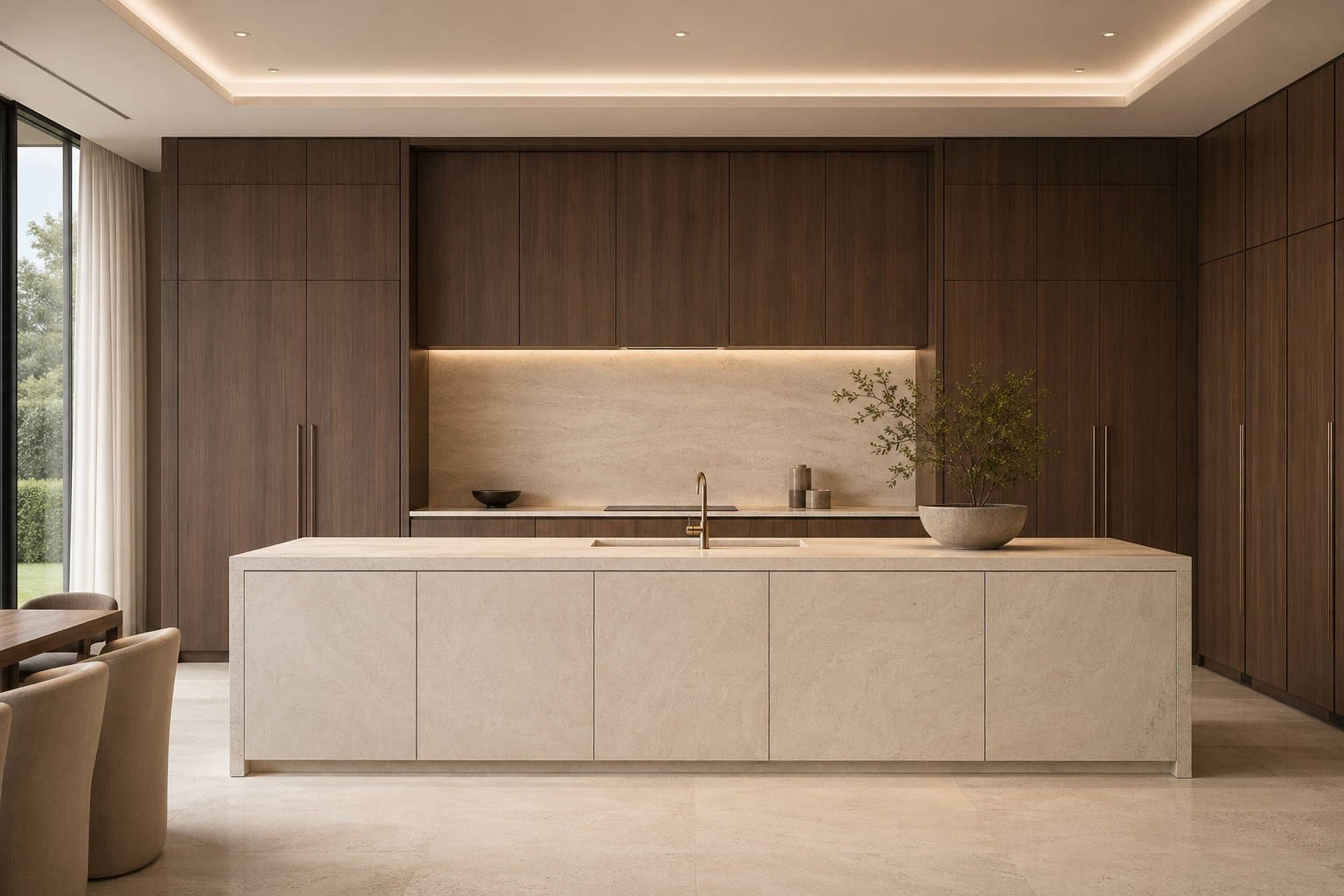 Walnut-toned planes and pale surfaces create residential warmth while keeping the room calm, precise, and visually mature.