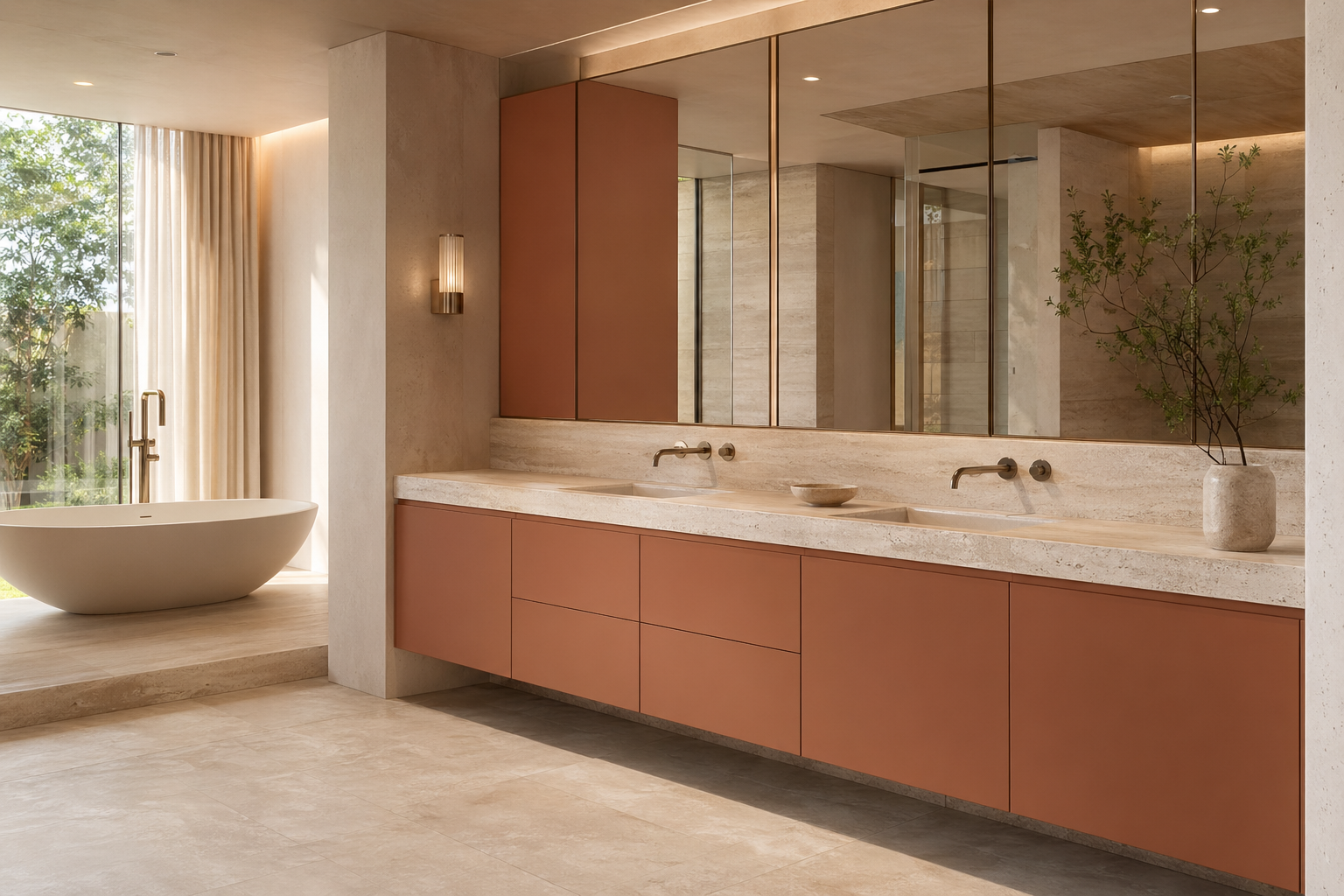 The image direction should feel warm, restorative, and architectural. Show terracotta-toned cabinetry, pale travertine, a soft mirror plane, restrained champagne accents, and gentle daylight that makes the bath suite feel like a premium residential wellness room.