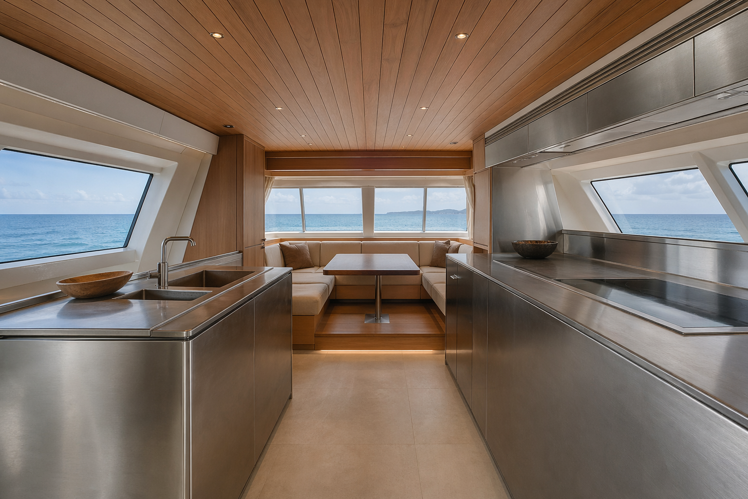 The owner brief required a nautical interior that still felt residential: teak tone, pale stone, woven textile, and ocean daylight, not a cold steel service corridor. The material decision therefore had to balance 304 stainless steel hygiene with warm finishes across the galley island, bath vanity, salon console, and aft-deck service threshold.