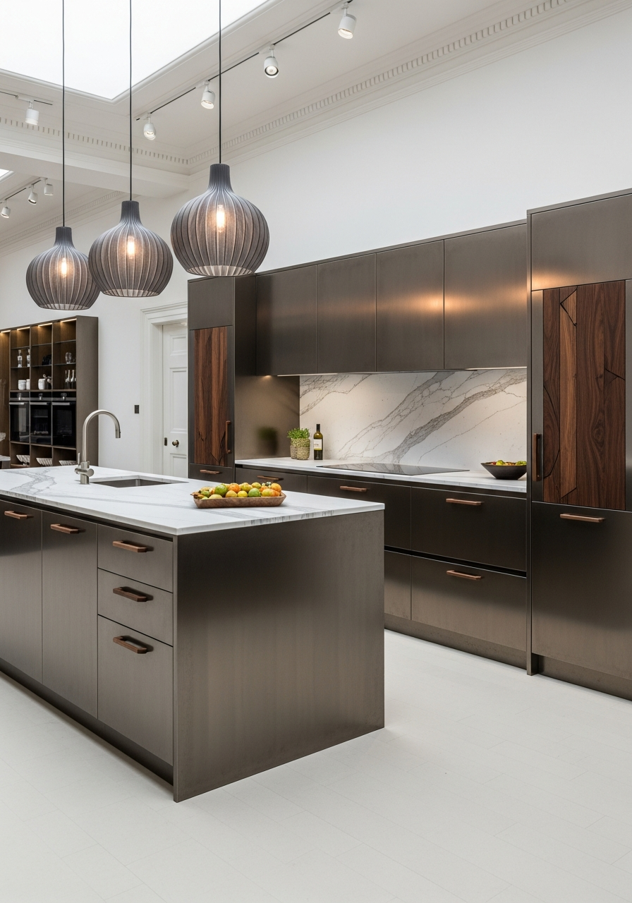 The finish palette responded directly to local material preferences. PVD bronze coatings reference Chelsea's brass hardware heritage while offering gem-grade surface density through microparticle crystal resin technology—scratch-resistant, stain-proof, and maintenance-free compared to living finishes. Carrara-white and Portland-grey surfaces provide the veined stone aesthetic ubiquitous in Georgian interiors without porosity or sealing requirements. All powder coats are baked at 220°C for molecular-level adhesion, exceeding KCMA A161.1 finish performance standards. Dark timber accents—walnut and fumed oak—function as tactile counterweights in dry zones, acknowledging the dark kitchen trend while reserving steel's dominance for wet environments.