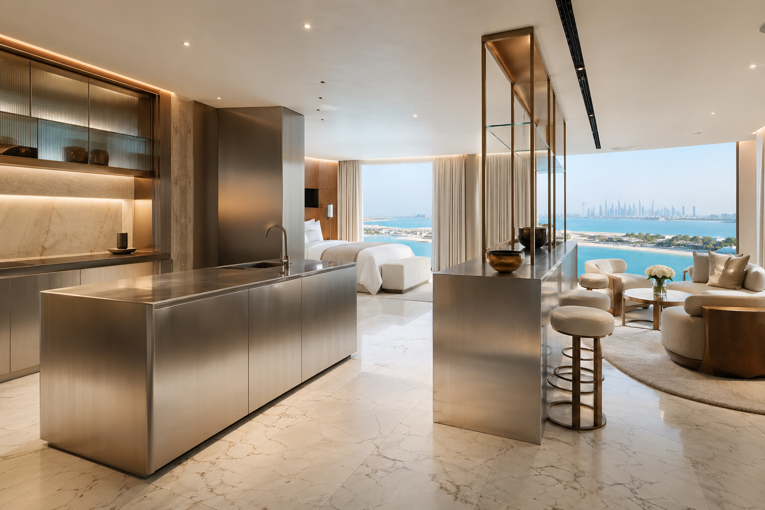 Brushed and bead-blasted 304 stainless steel can sit beside Italian marble, bronze trim, tinted glass, palm planting, and skyline daylight without making the suite feel like a back-of-house kitchen.