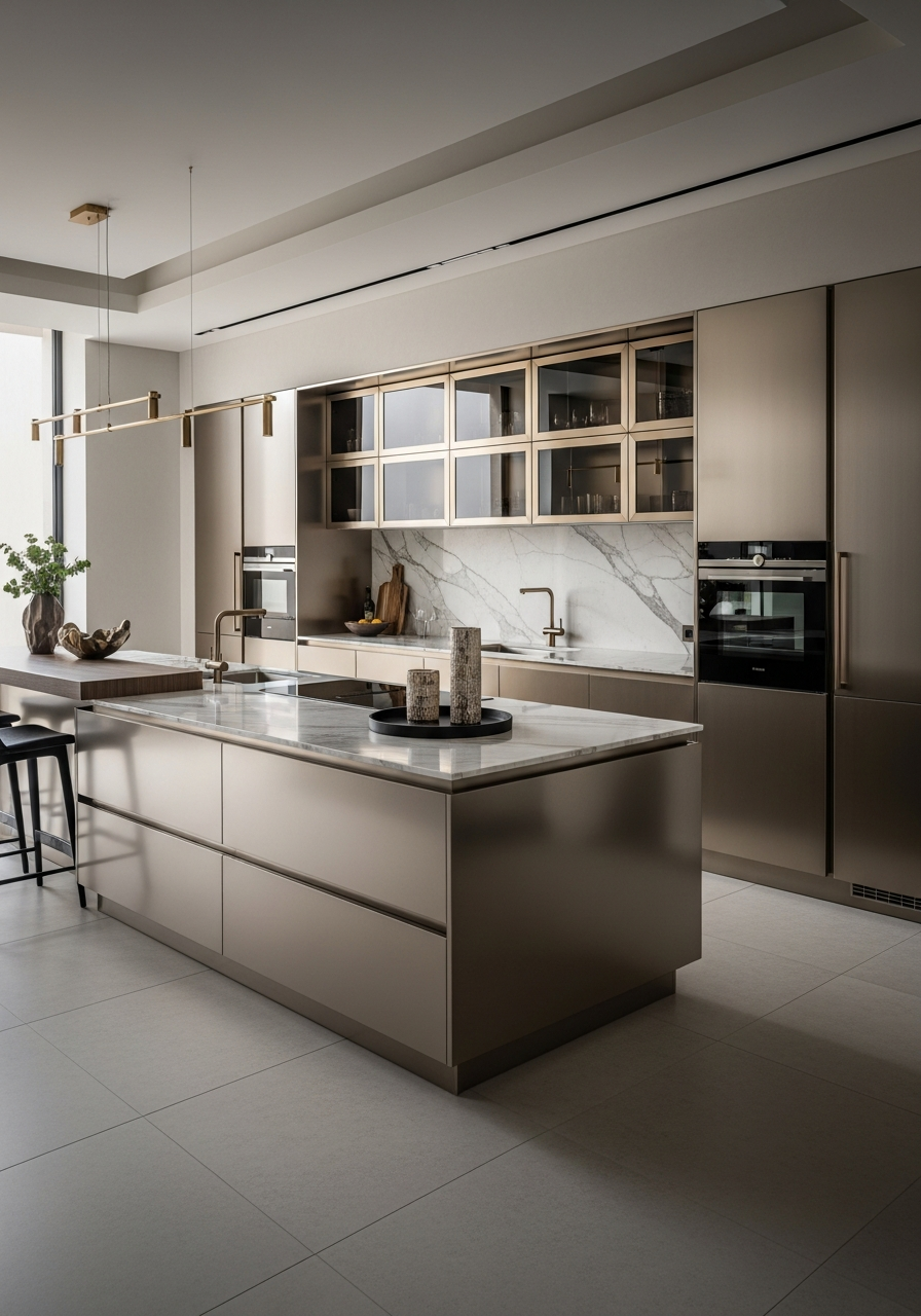 The suite is organized around a show kitchen and wine-bar sequence that opens toward the living area and skyline. Dark stone forms the visual anchor, while brushed 304 stainless steel surfaces add a durable, precise counterpoint to bronze-gold PVD warmth and tinted glass.