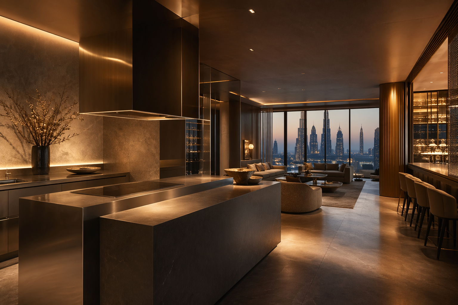 It uses dark stone, tinted glass, bronze-gold PVD warmth, skyline views, and controlled architectural lighting to reflect Dubai's preference for opulent but restrained luxury.