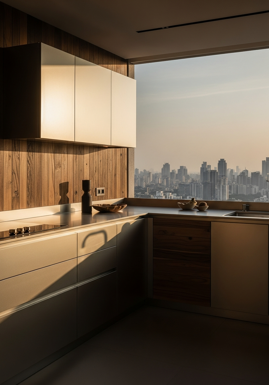This luxury penthouse kitchen Mumbai concept occupies 290 sqm on the 42nd floor of a tower overlooking the Bandra-Worli Sea Link, where the Arabian Sea generates salt-laden winds averaging 75% annual humidity and monsoon rainfall exceeding 2,400mm annually. The design challenge centers on material survival: conventional wood-based cabinetry in this environment typically exhibits joint swelling, veneer delamination, and hardware corrosion within 18-36 months of installation. The project demanded a monsoon-proof kitchen design Mumbai developers had yet to source—one that could maintain dimensional stability through thermal cycling from 24°C to 38°C while supporting the social function of the kitchen as primary entertaining space in Indian luxury residential culture.