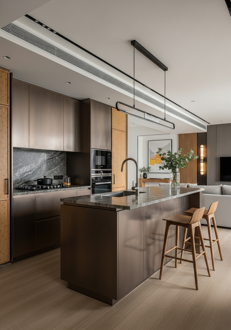 The finish strategy deploys 220°C baked powder coating in deep bronze and champagne gold, colors selected to absorb Taipei's abundant natural light without the glare that plagues high-gloss surfaces in south-facing apartments. Bronze PVD finishes reference the patinated copper roofs of Taiwan's Japanese colonial architecture, creating material continuity with the island's built heritage. The microparticle crystal resin surfaces achieve gem-grade density (Mohs hardness 6-7), providing the tactile satisfaction of polished river stones while resisting the scratching and staining common in high-use urban kitchens.
